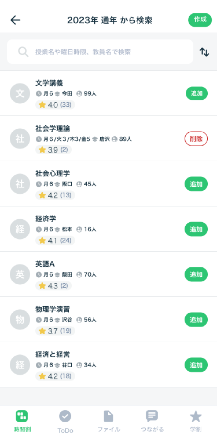 公式シラバスのデータから、自分に合った授業をサクサク登録。先輩の授業レビューを見ながら、あなたにぴったりな時間割を作れます。